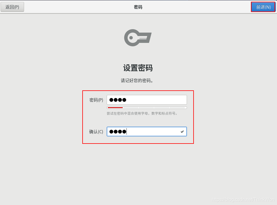 设置密码(后面登录用),为方便记忆,这里设置为root,然后点击前进