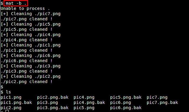 如果不为mat命令提供任何选项,默认操作会移除文件的元数据。如果要在清理的过程中保留原始文件的备份,使用“-b”选项。下面命令会清除所有文件的元数据,并将原始文件存储为“*.bak”文件。