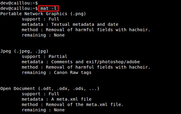 与诸如exiftool等只能对有限种类的文件类型进行写入的工具相比,mat支持从各种各样的文件中消除元数据:图片(png、jpg)、文档(odt、docx、pptx、xlsx和pdf)、归档文件(tar、tar.bz2)和音频(mp3、ogg、flac)等。