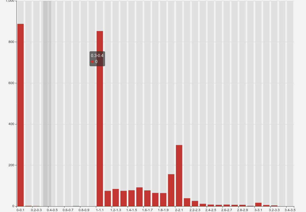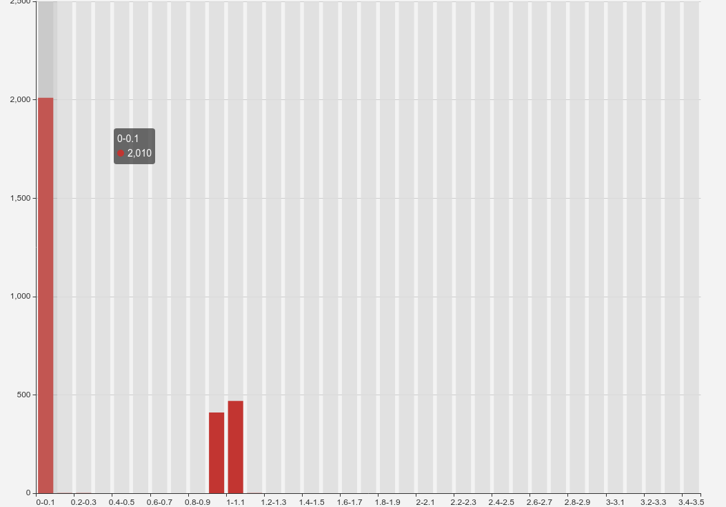 图二:大约 1/4 的请求其实已经在 0.1s 内返回了,但是 1 ~ 1.1s 也有 1/4 的请求落上去了,随后的结果与图一类似。