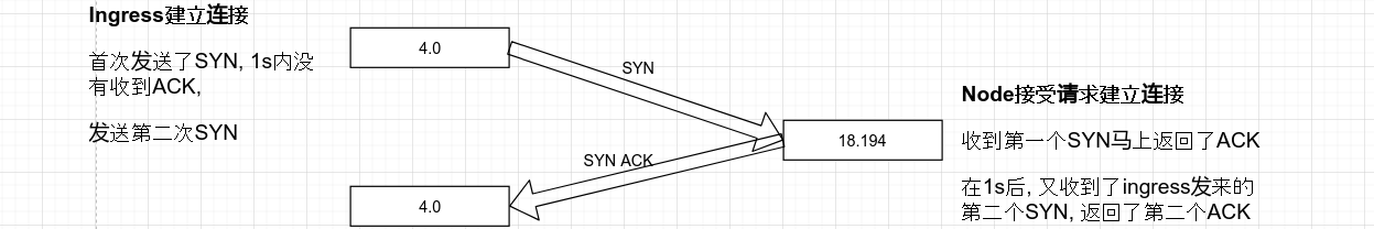 从 Node 侧查看,Node 在 Ingress 数据包发出后不久马上就收到了 syn,也立刻进行了 syn 的返回,但是不知为何 1s 后才出现在 Ingress 处。