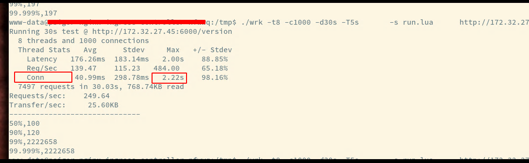 既然可以了解到 TCP 连接的建立时间比较久,我们可以用它来作为一个衡量指标,我把 wrk 也修改了下,增加了对于连接时间的测量,具体的PR见这里,我们可以利用这一项指标衡量后端的服务情况。