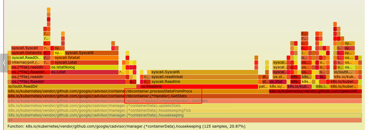 而后,我针对机器中的 kubelet 进行了一次追踪,从火焰图中可以确认,大量的时间耗费在了读取内核信息中。