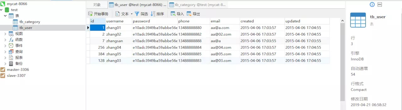 可以看到mycat,mysql主从都创建了该表