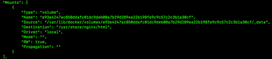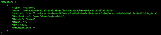 接下来使用 docker inspect 命令查看刚刚创建的容器的具体情况,找到数据卷映射目录,如下: