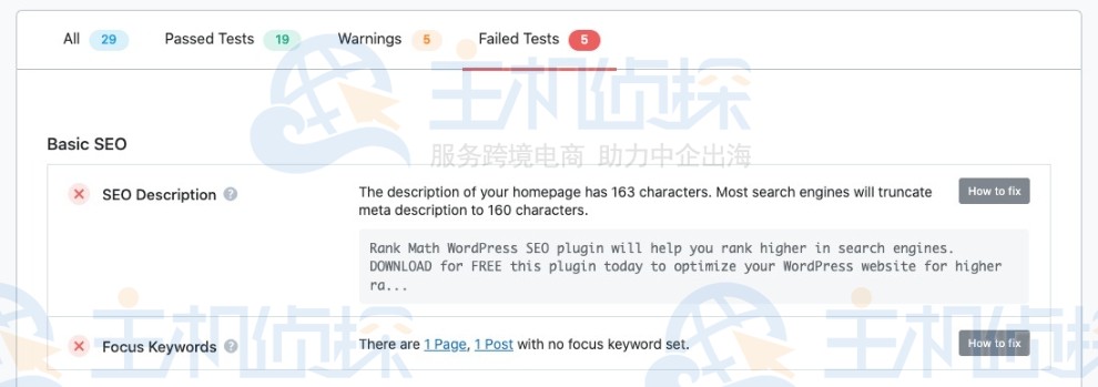 如果您正在寻找可操作的见解,请单击“失败的测试”选项卡以立即显示所有缺失/不正确的SEO元素。Rank Math使解决这些SEO问题变得更加容易。单击每个测试旁边的“如何修复”选项,然后按照说明解决它们。