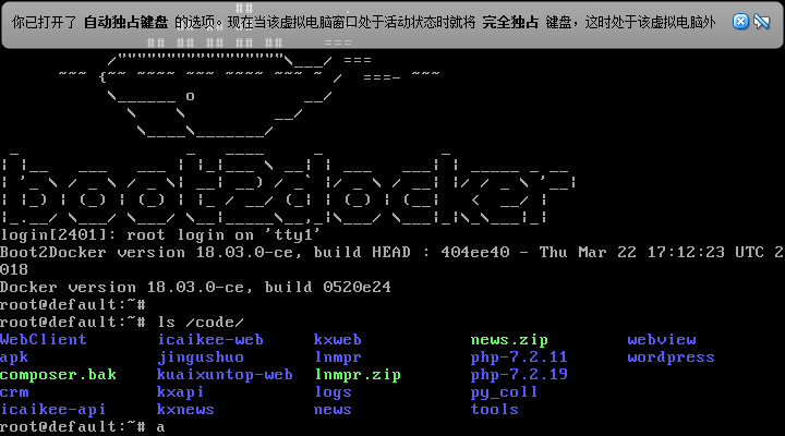 这是一个docker的快速启动命令行管理工具,有点类似与git bash,会显示docker启动时的所有启动日志和信息,上图中大家可以清楚的看到启动的过程,和启动之后的vm命及对应的ip192.168.99.100,但是里面包含的工具命令并不是很齐全,常用命令: