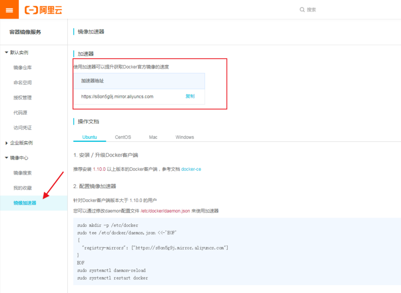 如果有阿里云用户的同学可以直接去阿里云获取加速器地址,如果没有的话可以找一些国内免费加速。