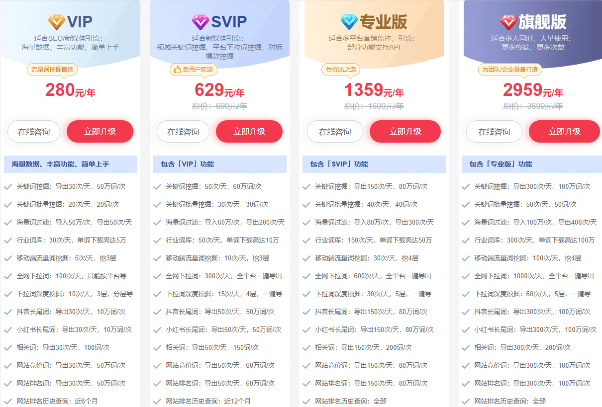 5118关键词挖掘工具分为免费版、VIP版、SVIP版、专业版和旗舰版,根据不同版本价格如下: