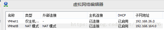 3)然后需要查看虚拟机的网络环境,点击编辑→虚拟网络编辑器,进入后查看vmnet8网卡的状态,如下图: