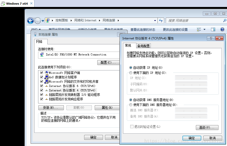 右键点击本地连接,打开属性→internet协议版本4(tcp/ipv4)后将属性如下图设置: