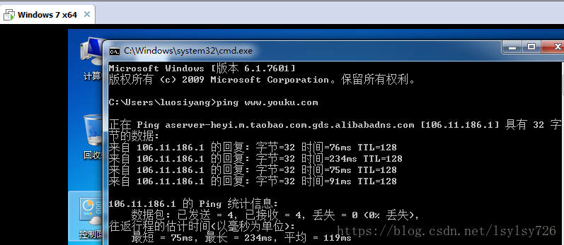 6)还可以在dos窗口下ping一个网址,如ping优酷首页www.youku.com,结果如下图: