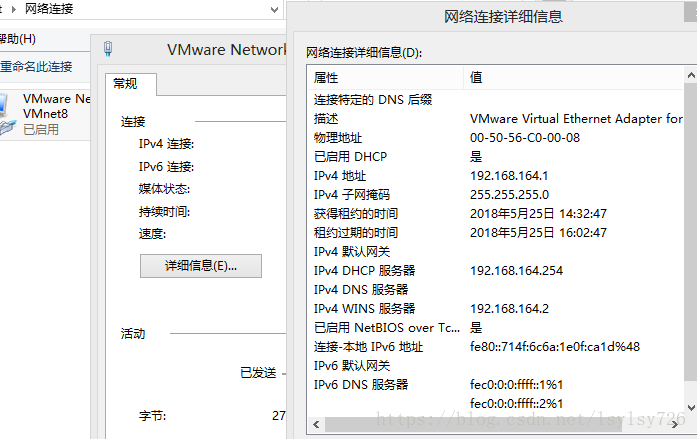 方法一:打开物理机网络和资源共享中心→更改适配器设置,右键点击vmnet8→状态→详细信息即可查看物理机nat模式下的ip地址,如下图: