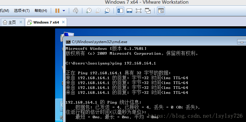 2)打开虚拟机的windows7系统,然后开启dos命令窗口,输入ping 192.168.164.1即可使用虚拟机ping物理机,如下图: