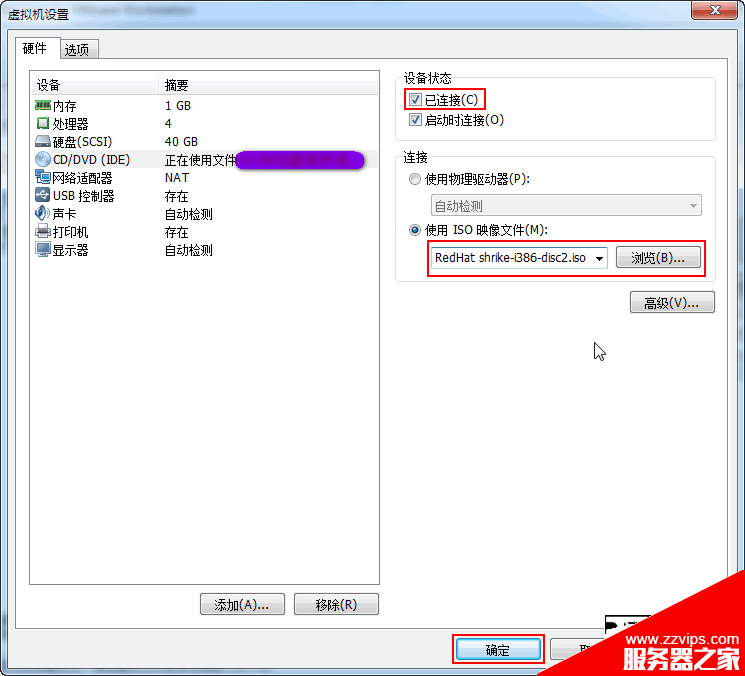 不过,大多数人都没有勾选上图【设备状态】面板中的【已连接】,从而导致更换后的ISO镜像文件并没有生效,因此RedHat Linux安装程序也检测不到更换后的光盘,从而提示错误信息:该光盘无法被挂载。