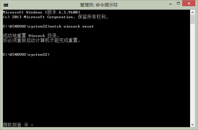 3、回车后,你将收到“成功重置 Winsock 目录,你必须重新启动计算机才能完成重置”的提示,重启一下计算机。