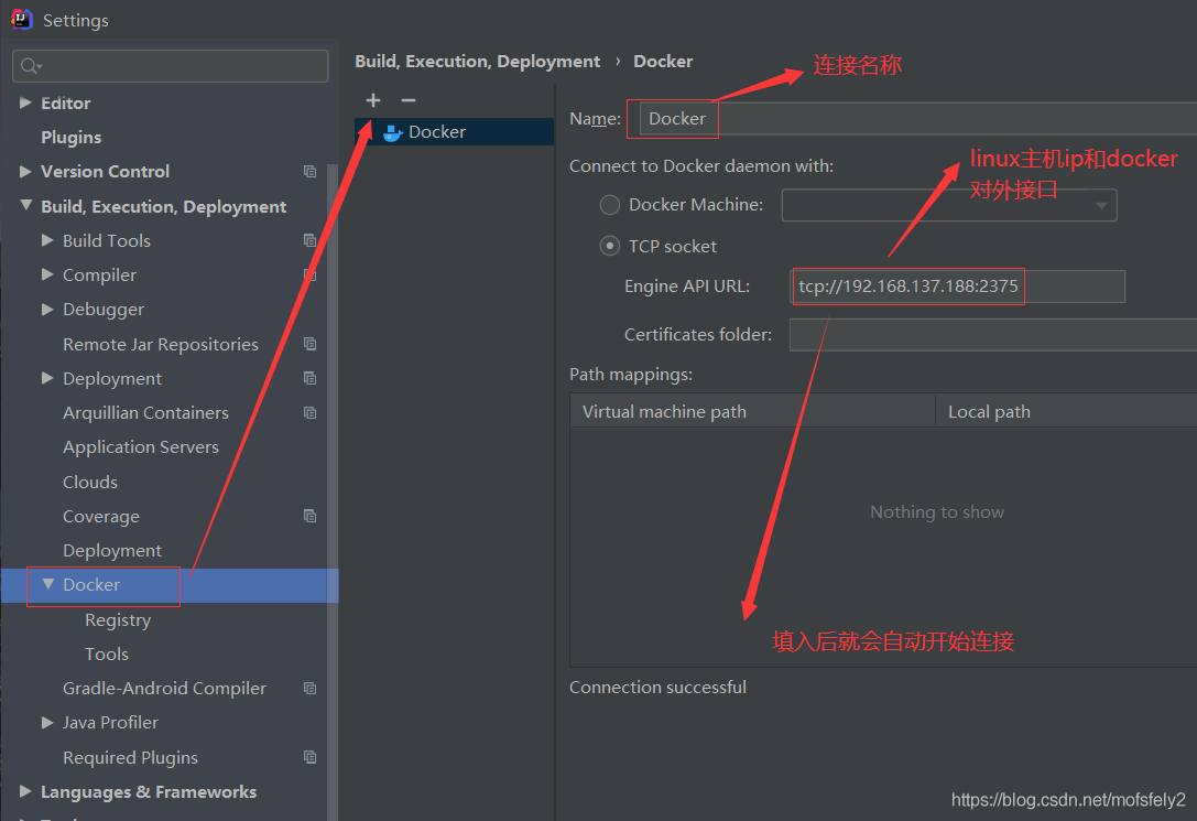 注:docker— 点击“+”后,填入连接名称和linux主机ip:docker对外端口