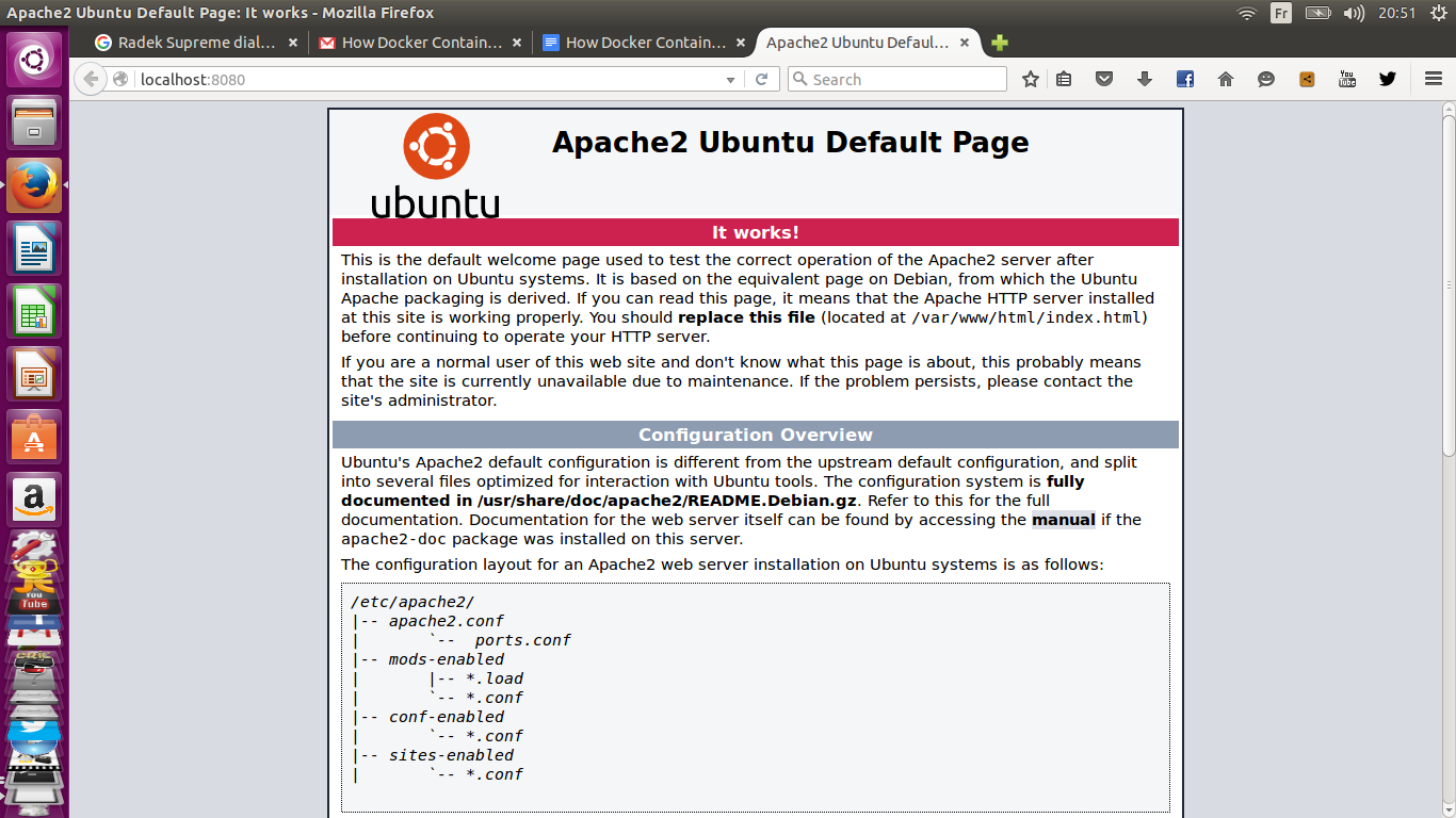现在,我们可以从宿主系统去访问http://localhost:8080/,同时应该能看见基于Apache HTTP服务的默认页面。