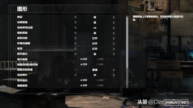 本次采用 古墓丽影10:崛起 自带的性能测试来测试在Win10卓越性能模式下和平衡模式下对游戏帧数是否会有影响。下面是画面设置