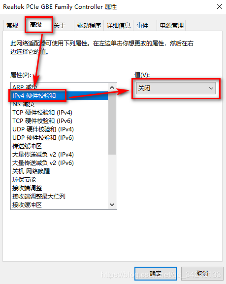 4. 在 "高级" 选项卡里把属性为 "ipv4硬件校验和" 的值改为 "关闭"