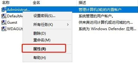 3、随后右击管理员帐户,并在此选择属性。