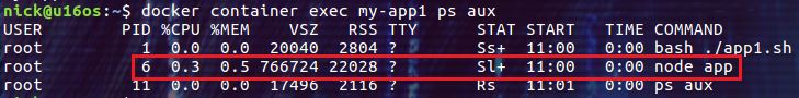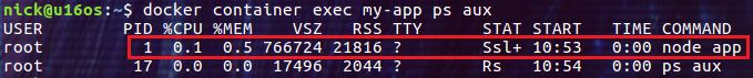 请注意 entrypoint 指令的写法,这种写法会让 node 在容器中以 1 号进程的身份运行。