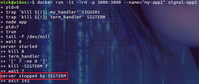 这个脚本文件在启动应用程序的同时可以捕获发送给它的 sigterm 和 sigusr1 信号,并为它们添加了处理程序。其中 sigterm 信号的处理程序就是向我们的 node 应用程序发送 sigterm 信号。