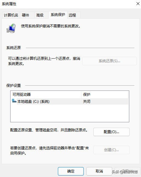 检查窗口中的保护设置;如果你在主驱动器或其他驱动器旁边看到“关闭”,表示系统还原未打开。你还会注意到页面上的“系统还原”按钮也未处于活动状态,这意味着你无法使用它来将系统还原到以前的状态。