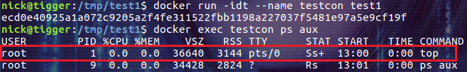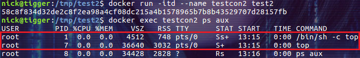 $ docker exec testcon2 ps aux |