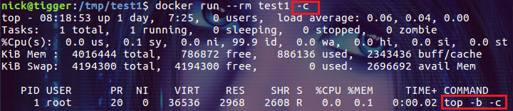 $ docker run -- rm test1 -c |