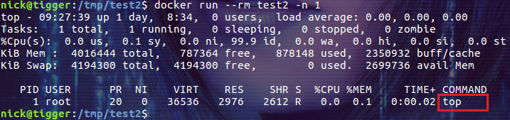 $ docker run -- rm test2 -n 1 |