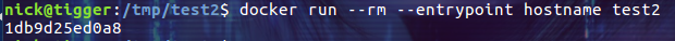 $ docker run -- rm --entrypoint hostname test2 |