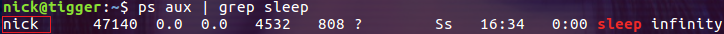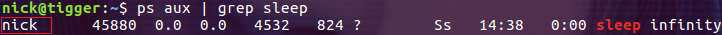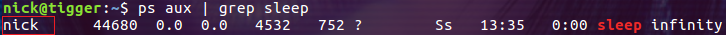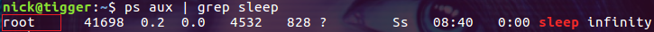 因为我们在命令行上指令了参数 –user 1000,所以这里 sleep 进程的有效用户显示为 nick。进入到容器内部看一下: