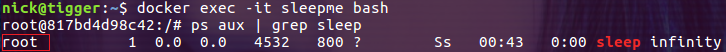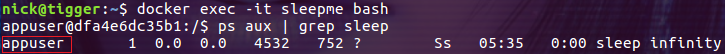 $ docker run -d --user 1000 --name sleepme ubuntu sleep infinity |
