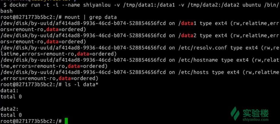 docker run -t -i --name shiyanlou - v /tmp/data1 : /data1 - v /tmp/data2 : /data2 ubuntu /bin/bash |