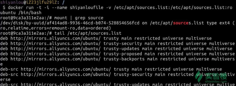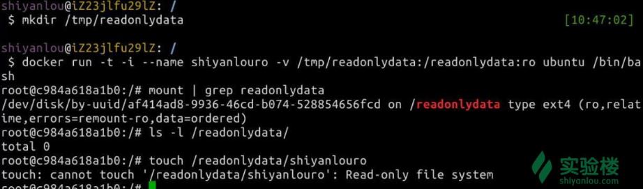 docker run -t -i --name shiyanlouro - v /tmp/readonlydata : /rodata :ro ubuntu /bin/bash |