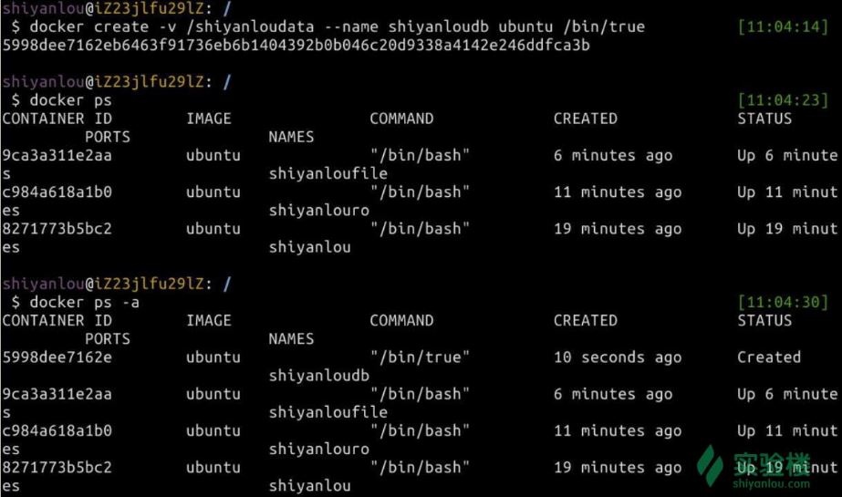 docker create - v /shiyanloudata --name shiyanloudb ubuntu /bin/true |