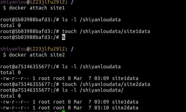 创建site1和site2两个容器挂载数据卷容器shiyanloudb: