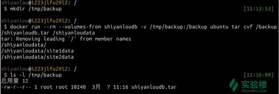 docker run -- rm --volumes-from shiyanloudb - v /tmp/backup : /backup ubuntu tar cvf /backup/shiyanloudb . tar /shiyanloudata |