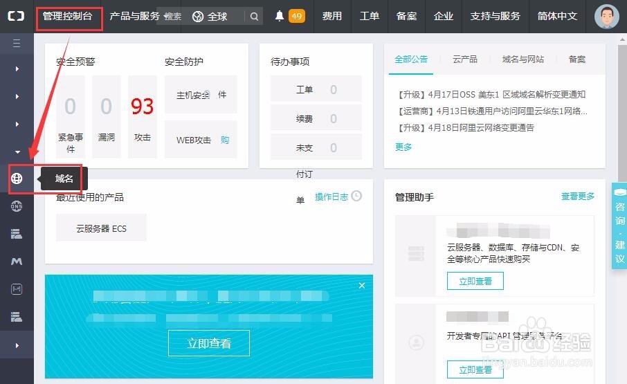 上面的几个步骤大家都做好之后,我们就可以开始设置域名解析了,设置域名解析其实按为了安装我们上传到服务器站点目录上的网站源码。接下来我说下阿里云万网域名接续的具体步骤,打开阿里云网站并登陆进入管理控制台,然后点击左侧的域名菜单进入。