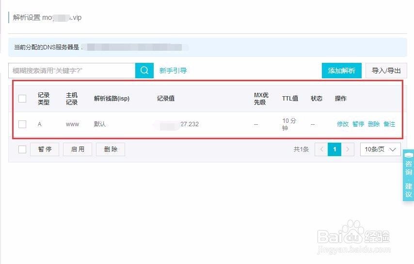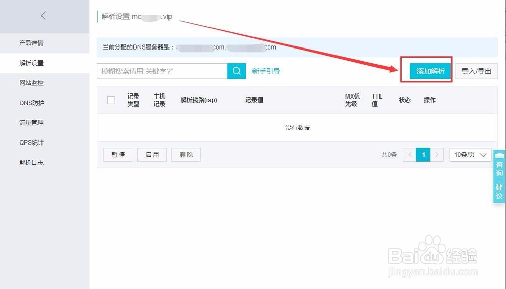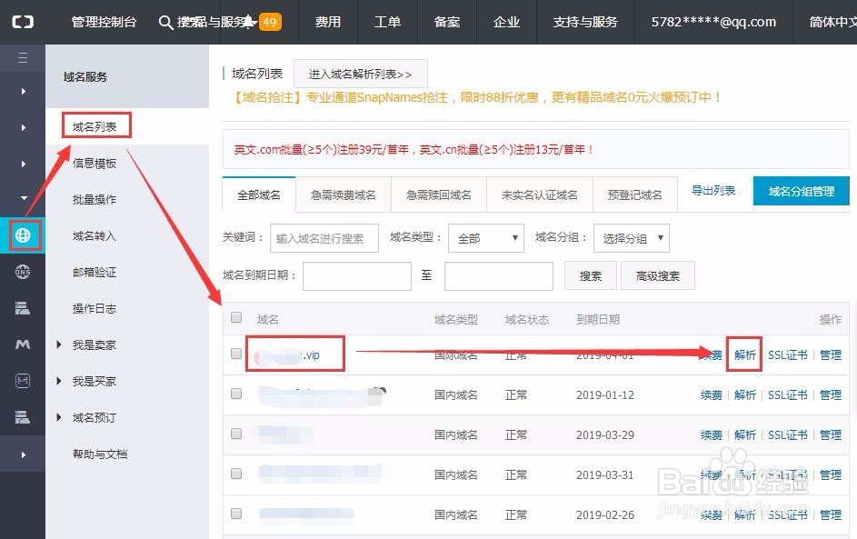 在域名控制台,我们就可以看到我们已经购买了的域名列表了,也可以看到上次我们写的经验购买的域名了。在对应的域名右侧就有解析的功能选项,点击解析就会进解析设置页面。