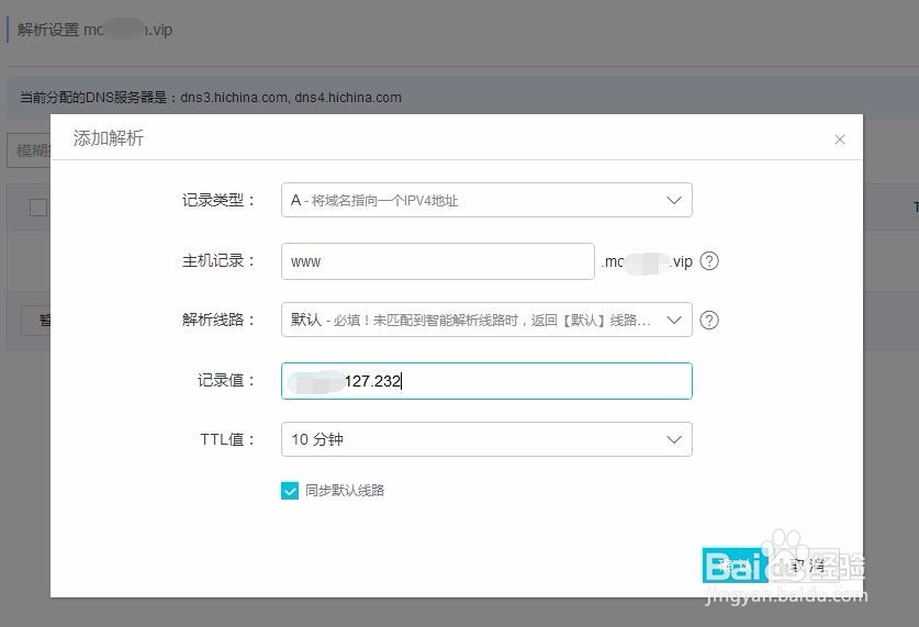 然后在添加解析页面填写对应的信息,记录类型默认是A,主机记录用www,解析线路不改,记录值就是我们购买的云服务器分配的公网IP,TTL值不改,都填好后点击确认。