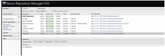<distributionManagement> <repository> <id>releases</id> <url>http://localhost:8081/nexus/content/repositories/releases</url> </repository> <snapshotRepository> <id>snapshots</id> <url>http://localhost:8081/nexus/content/repositories/snapshots</url> </snapshotRepository> </distributionManagement>