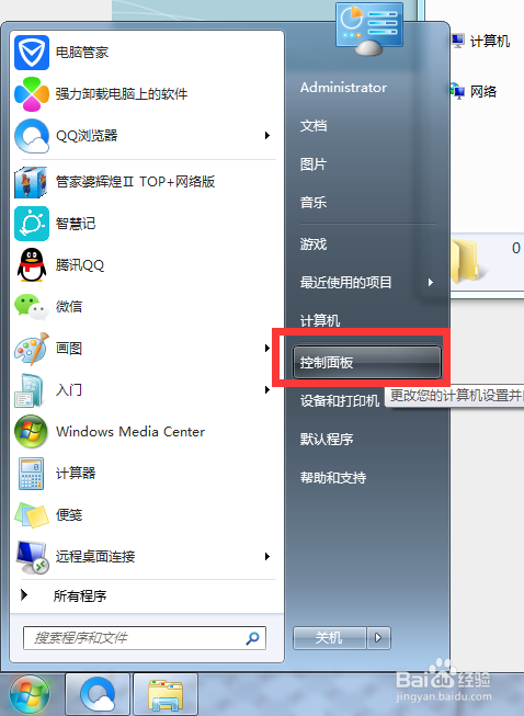 点击开始菜单,选择控制面板,打开控制面板界面。