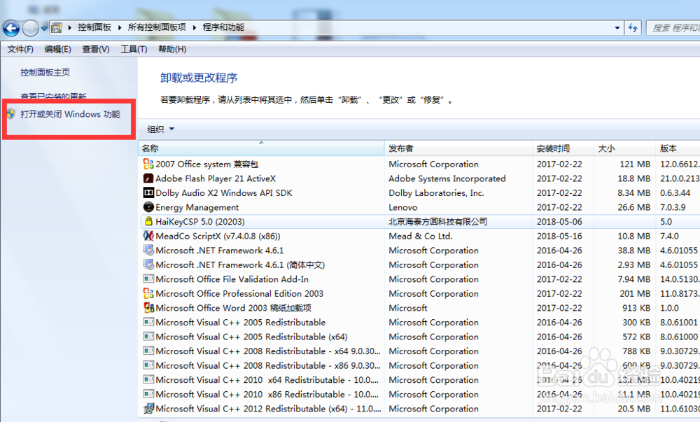 点击程度和功能左侧菜单里面的打开或关闭windows功能