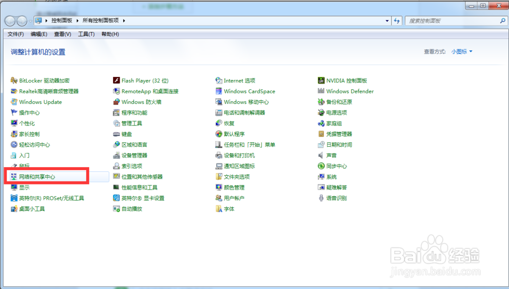 打开开始菜单的控制面板,点击网络和共享中心。