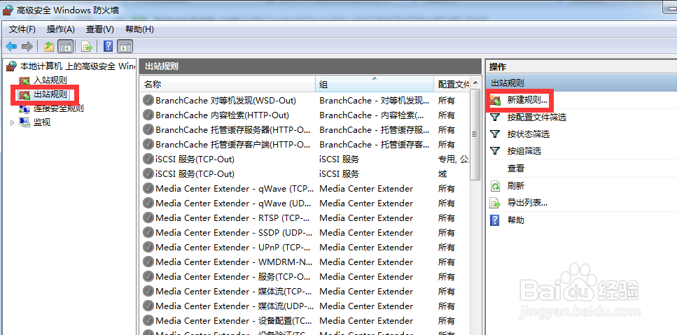 再点击左侧菜单里的出站规则,然后点击右侧的新建规则,如图所示。