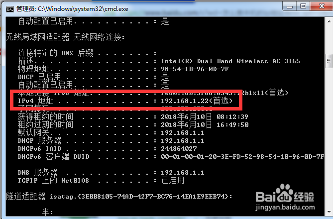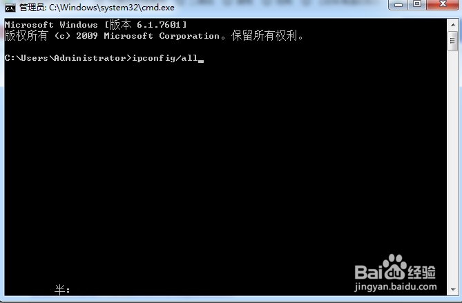 在命令提示符中输入 ipconfig/all,然后回车。