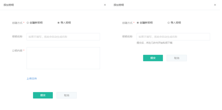 导入密钥:选择「导入密钥」,上传本地公钥文件或填写公钥内容导入本地密钥。