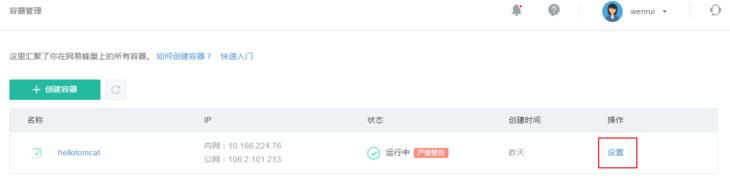 创建成功后,可对容器进行设置。在容器列表中点击相应的「设置」按钮,可设置的内容有:容器描述和环境变量。
